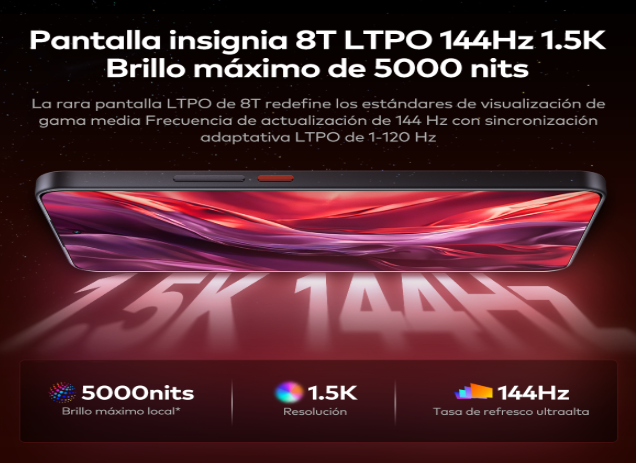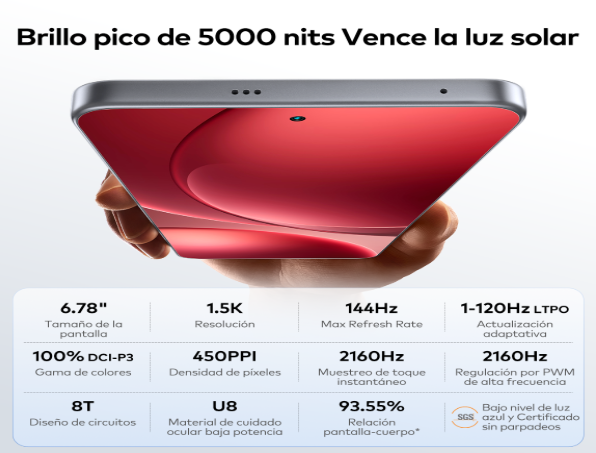 La pantalla es uno de los puntos más destacados. No tiene soporte visible y presenta un diseño simétrico con biseles ultrafinos de solo 1.75 mm, algo único en este rango de precio. Además, mantiene el característico borde blanco de Meizu con un sutil efecto 2.5D. El panel es de 6.78 pulgadas con resolución 1.5K, tecnología 8T LTPO y tasa de refresco adaptativa de 1 a 120 Hz (máximo 144 Hz). La relación pantalla-cuerpo alcanza el 93.55%, con un brillo máximo de 5000 nits. En protección ocular, ofrece atenuación PWM de alta frecuencia de 2160 Hz, la tecnología “Ruran Eye Care” de Meizu y certificación SGS de baja luz azul y sin parpadeo. En cuanto al control táctil, se ha incorporado una optimización completa mediante IA, mejorando la respuesta un 50% y, además, permite el uso con las manos húmedas. Esto significa que incluso bajo la lluvia, con sudor o salpicaduras, la pantalla sigue siendo totalmente funcional, ideal para quienes usan el móvil en exteriores.