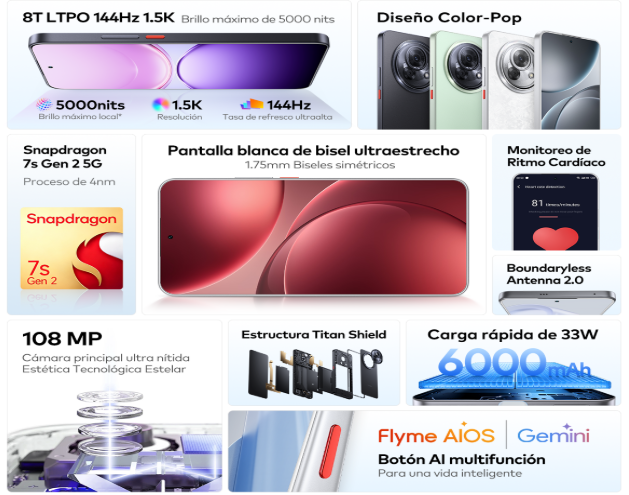También integra el sistema de antena “Boundless Antenna 2.0” de los modelos insignia de Meizu, que optimiza la colocación central para mantener una conexión estable incluso al sostener el teléfono en modo horizontal.