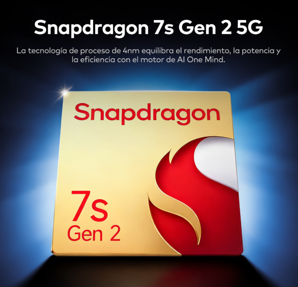 Procesador Snapdragon 7s + 512 GB de almacenamiento El Meizu Lucky 08 incorpora el procesador Snapdragon 7s Gen 2 con almacenamiento UFS 3.1, garantizando un alto rendimiento y gran capacidad. El chip está fabricado con tecnología de 4 nm y, junto con el motor OneMind, ofrece un funcionamiento fluido.